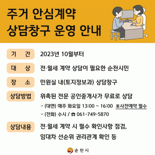 순천시 관계자는 “전.월세 계약을 앞두고 부동산 선순위 권리관계 등 부동산 정보 취득에 어려움이 있는 시민이 전문 공인중개사와의 상담을 통해 필수적인 계약정보를 습득하고 안전하게 계약을 체결하는데 도움이 되길 바라며, 많은 이용을 부탁드린다”라고 말했다.