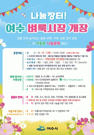 시 관계자는 “여수 벼룩시장은 자원순환과 함께 기부참여 등 어린아이를 동반한 가족단위 참여자들에게 뜻깊은 행사가 될 것”이라며 “시민들의 많은 관심과 참여를 바란다”고 전했다.