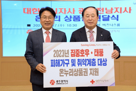 광주시는 적십자사 광주전남지사에서 전달받은 성금(온누리상품권 1만원권 1000장)을 적십자사 뜻에 따라 올해 집중호우와 태풍으로 피해를 입은 세대와 취약계층 등 200세대에게 전달할 예정이다.