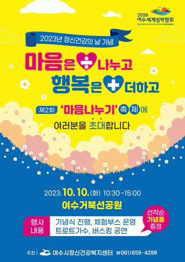 이번 행사는 여수시민 누구나 무료로 참여 가능하며, 단체(기관) 참여는 여수시정신건강복지센터로 문의하면 된다.