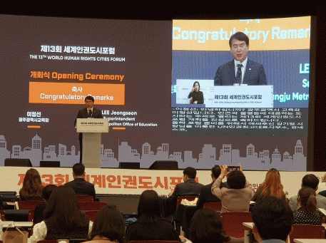 이정선 교육감은 축사를 통해 “사회·경제·문화적 불평등의 해결은 인류 공동의 노력이 요구되는 것이다. 하나 되는 힘, 즉 연대를 통한 협력과 실천력이 모아져야 한다”며 “광주교육은 인권 감수성이 풍부한 가슴 따뜻한 세계민주시민을 길러내어 세계와 연대하고 함께 행동하게 할 것이다”고 말했다. 이어 “제13회 세계인권도시포럼을 통해 인권 앞에 놓인 빈곤과 불평등 해결을 위해 상호 연대하는 계기가 되기를 기대한다”고 덧붙였다.