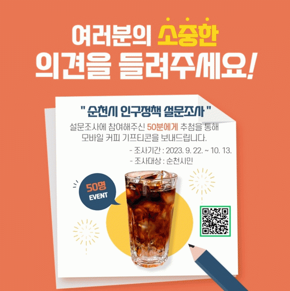 설문조사는 온.오프라인을 병행해 실시하며, 온라인 링크 또는 QR코드를 통해 참여한 시민 중 50명을 추첨하여 모바일 커피쿠폰을 증정할 예정이다.