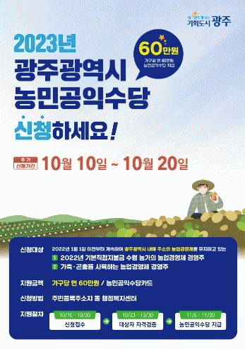 광주광역시는 농민공익수당을 미처 신청하지 못한 농가를 지원하기 위해 10일부터 20일까지 10일간 추가 접수를 진행한다.