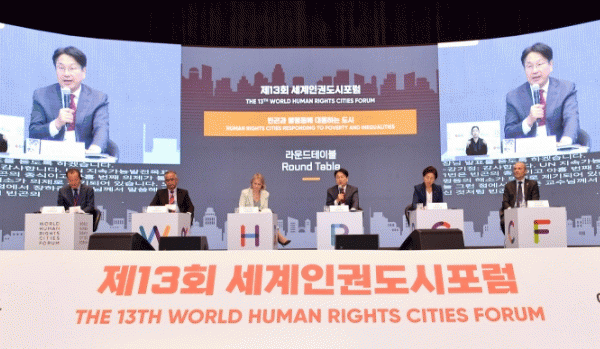 강 시장은 이어 “빈곤과 불평등에 맞서는 인권도시는 공동체와 도시의 회복을 위해 더욱 노력해야 한다. 우리 사회가, 책임있는 자들이, 포기하지 말고 다시 회복의 길을 열 수 있도록 보다 책임있는 약속과 실질적인 이행이 필요하다”고 강조하면서 연대와 협력 방안 강화를 제안했다.
