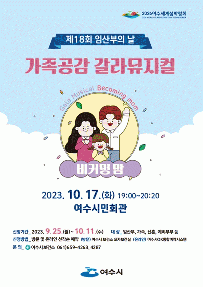 공연 관람료는 무료이며, 관람 희망자는 오는 11일까지 ‘여수시OK통합예약시스템’ 온라인 예약 또는 ‘여수시보건소 모자보건실’로 방문 신청하면 된다. 단, 접수는 300여명 선착순으로 마감된다.