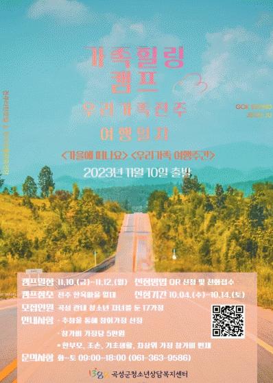 가족힐링캠프는 가족 간의 관계를 강화하기 위한 프로그램으로, 곡성군 청소년상담복지센터의 주최로 11월 10일부터 12일까지 전북 전주에서 진행된다. 가족들은 2박 3일 동안 전주 한옥마을 일대에서 직접 여행 지도를 만들고, 다양한 프로그램을 함께 체험하면서 서로에게 더욱 집중하고 감정적인 유대감을 강화하는 시간을 가지게 된다.