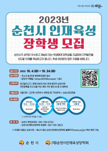 신청서 서식 및 구비서류, 선발내용 등 자세한 사항은 (재)순천시인재육성장학회 누리집이나 평생교육과, 후원회로 문의하면 되고, 장학생은 11월 말까지 평가·심의를 거쳐 장학회 이사회 심의·의결을 통해 최종 확정된다.
