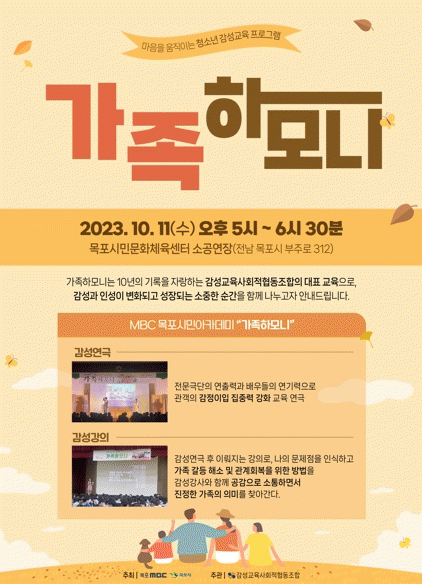 목포시 관계자는 “이번 프로그램을 통해 얻은 가족에 대한 소중한 마음을 가지고 우리 모두가 따뜻한 공동체 사회로 이어갔음을 희망한다”며 “감성교육에 관심이 있는 시민 여러분과 특히, 학부모와 자녀가 동반 참여해 참된 인성교육의 기회를 가질 수 있도록 많은 관심과 참여를 부탁드린다”고 말했다.
