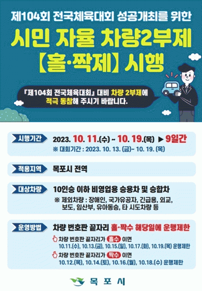 목포시는 이번 전국체전이 개항 후 주개최지가 되어 열리는 최초 국가 단위 스포츠 대축제인 만큼 자율 차량 2부제에 많은 시민들의 참여를 당부했다.