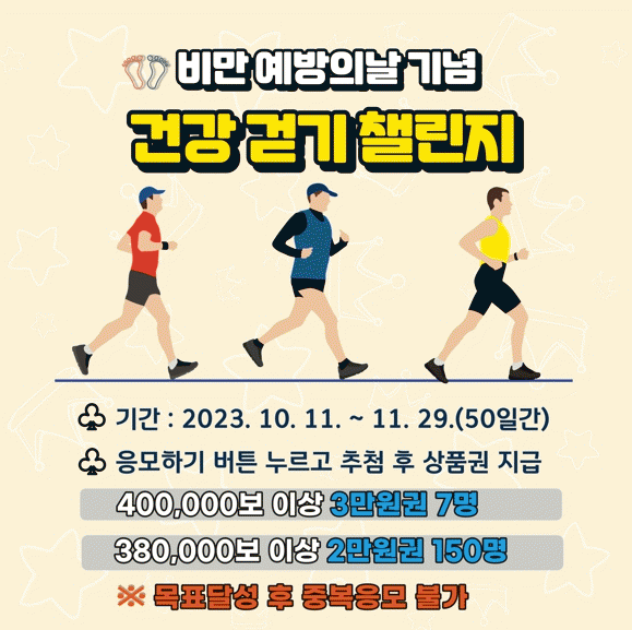 챌린지 기간 중 40만보를 걸으면 40만 마일리지가 쌓이고, 응모자 중 7명에게 모바일문화상품권 3만원권이 지급된다. 38만보를 걸으면 38만 마일리지가 쌓이고, 응모자 중 150명에게 모바일 문화상품권 2만원권이 지급된다.