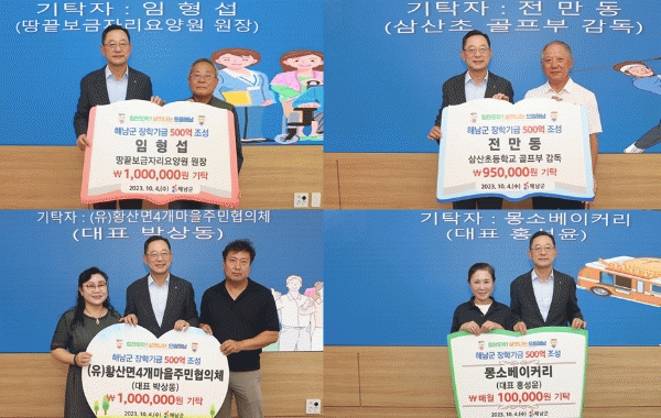 명현관 해남군수는“장학사업기금 500억원 조성에 여러차례 참여해 주신 분들이 늘어나는 등 공감대를 형성하며 자리매김하고 있다”며“소중한 마음을 담아 기탁해주신 기금은 인재 육성 및 성인들의 문해력 향상 등을 위해 귀중하게 사용될 것”이라고 감사의 마음을 전달했다.