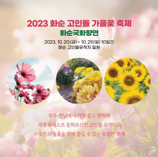 화순군 대표 축제인 『2023 화순 고인돌 가을꽃 축제』는 올해 4월 처음 열린 봄꽃 축제에서 33만여 명이 다녀갈 정도로 큰 인기를 누렸고, 코스모스·해바라기 등이 만개한 가을꽃 풍경과 개막 축하쇼, 각종 체험 부스 등 볼거리와 먹거리, 체험 거리가 풍부해 가을의 끝자락을 멋지게 장식할 것으로 기대된다.