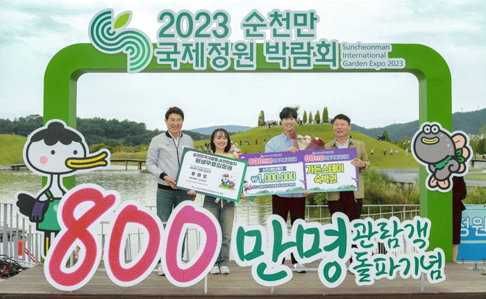 15시 19분 국가정원 동문으로 입장한 800만 번째 입장객은 광주에서 온 20대 커플이었다. 조직위는 행운의 입장객과 함께 800만 돌파를 기념해 조성한 꽃탑 제막식을 가진 뒤 떡케이크 커팅식을 진행했다. 노관규 이사장(순천시장)은 800만 번째 입장객에게 순천만국가정원 평생 무료 입장권을, 정병회 의장은 가든스테이 ‘쉴랑게’ 숙박권을 증정했다. 아울러 정원박람회 성공 개최를 위해 앞장서 온 일류순천 시민운동본부에서도 순천사랑상품권 100만 원을 후원해 전달했다.