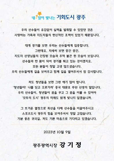 한편 강기정 시장은 항저우 아시안게임 개막을 앞두고 14개 종목 23명의 광주시 소속 선수단에 응원의 격려 카드를 보냈다. 또 아시안게임 기간 메달을 획득한 선수들에게 “광주시민과 함께 뜨거운 마음으로 응원하고 있고 자랑스럽고 고맙다, 돌아오는 날까지 다치지 말고 건강한 모습으로 귀국해서 만나자”는 축하메시지를 전했다.
