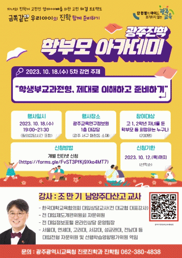 이번 달 열리는 광주진학 학부모 아카데미 강의는 고등학교 1, 2학년 자녀를 둔 학부모에 초점을 맞춰 진행된다. 이번 강의는 한국대학교육협의회 대입상담교사단 남양주다산고등학교 조만기 선생님이 강사로 나서 ‘학생부교과전형, 제대로 이해하고 준비하기’라는 주제로 이뤄진다. 현재 대학에서는 가장 많은 학생을 학생부교과전형을 통해 선발하고 있기에 많은 학부모가 이번 강의에 관심을 가지고 있다.