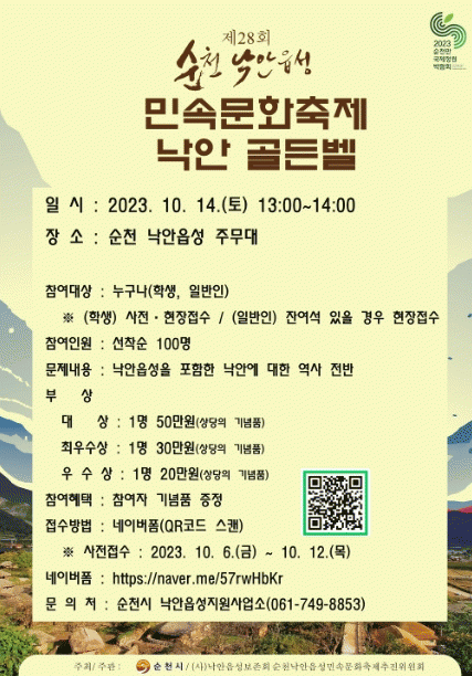 한편, 제28회 순천 낙안읍성 민속문화축제는 오는 13일부터 15일까지 3일간 개최된다. 안중걸 작가의 캐리커쳐 드로잉쇼, 무료 기념사진 촬영, 전통혼례, 성곽쌓기 및 백중놀이, 수문장 교대식 및 기마장군 순라의식, 낙안 골든벨, 민속놀이 경연대회, 상여소리 재현 등 다채로운 행사가 마련되어있다.