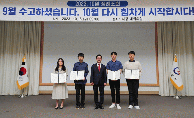 이날 조회에서 정 시장은 맡은바 업무를 성실히 추진한 시정발전 유공 직원 5명에게 표창장을 수여했다.