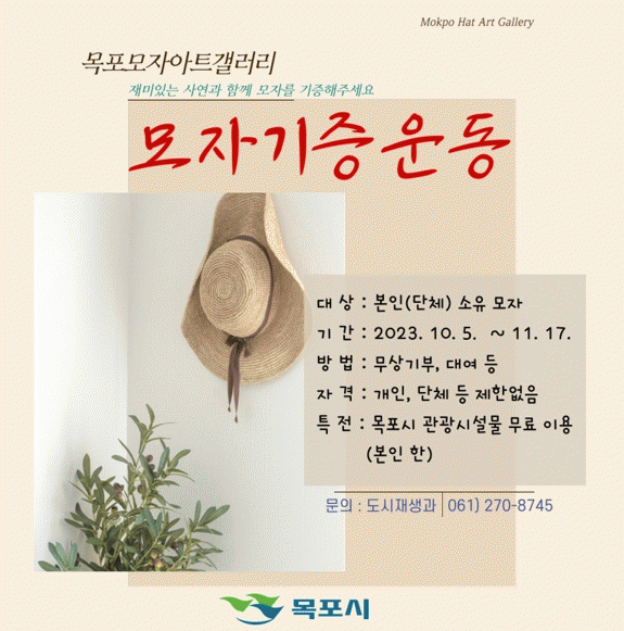 접수 기간은 오는 11월 17일까지이며, 신청서는 목포시 누리집 고시?공고에서 내려받아 작성 후 목포모자아트갤러리로 제출하면 된다. 신청서 접수 후, 모자의 상태, 보존 가치 등을 판단해 기증 여부를 결정한다.