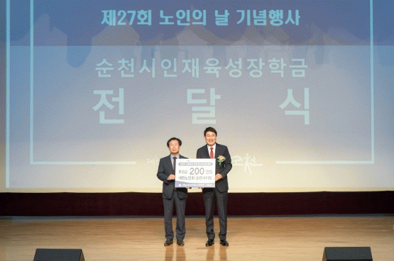 또한, 순천시노인회(회장 김영수)에서 순천시 미래인재 육성을 위한 장학금 200만 원을 순천시인재육성장학회(이사장 노관규)에 전달하며 미래인재 발굴에 대한 적극적인 관심과 정성을 보여주었다.