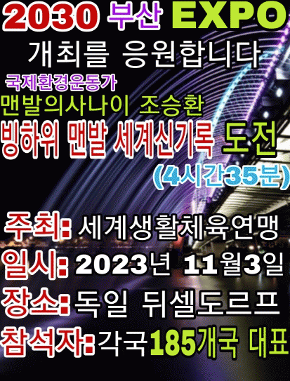 오는 11월 3일, 얼음 위 맨발 퍼포먼스를 통해 각국 185개국 대표들이 보는 앞에서 2030 부산세계박람회(EXPO) 유치를 응원하고, 지구온난화로 심각한 기후 변화와 이상기온을 각국 정상들과 지구촌인들에게 울림을 주기 위해서 도전에 나설 예정이다.