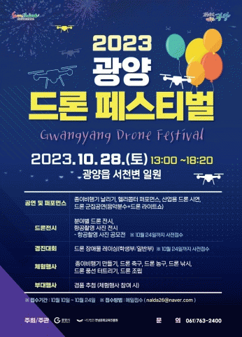 시상금이 주어지는 드론 장애물 레이싱 경진대회는 학생부와 성인부로 나눠 진행된다. 참여를 희망하는 시민은 10일부터 오는 24일까지 이메일로 신청하면 된다.