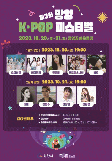 올해로 3회째를 맞는 광양 K-POP 페스티벌은 오마이걸, 에이핑크, 권은비, 프로미스나인, 비오 등 최강 라인업의 ‘K-POP’ 공연과 거미, 김범수, 이찬원, 김현정 등이 출연하는 ‘7080 & 트롯’ 공연 등 연이틀 축제 분위기 속에서 시민과 관광객을 맞을 계획이다.