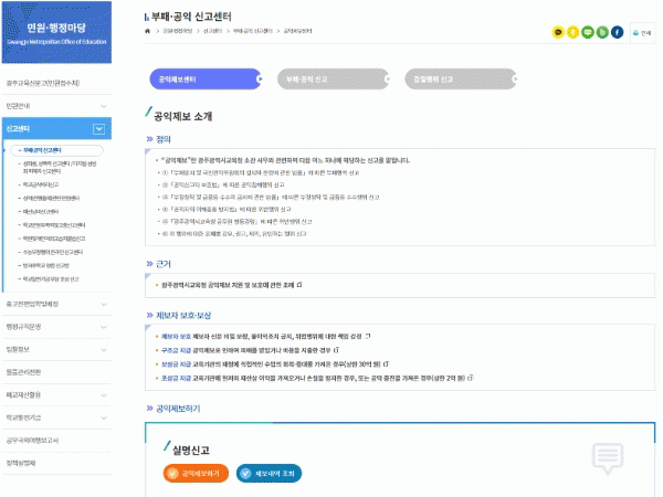 이번 온라인 창구 개설·운영은 같은 날 있었던 시교육청 누리집 개편과 함께 이뤄졌다. 광주시민 누구나 시교육청 누리집 민원·행정마당-신고센터-부패·공익신고센터-공익제보센터를 통해 시교육청 소관 사무와 관련한 공익 침해 행위 등을 손쉽게 제보할 수 있다.