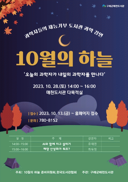 '10월의 하늘' 과학 강연은 한국도서관협회가 주최하는 행사로 매년 10월 마지막 토요일 전국 중소도시 50개 도서관에서 함께 열린다. 다양한 분야의 과학 전공자들이 한국도서관협회에서 선정한 도서관에서 기부 강연을 진행한다.
