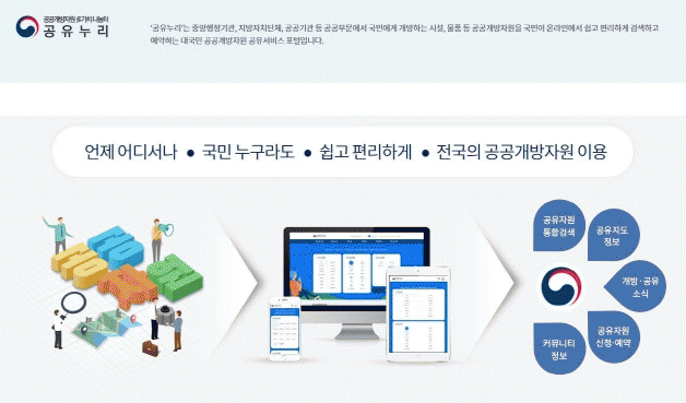 공유누리는 행정안전부와 조달청이 구축한 공유서비스 통합 플랫폼으로 중앙행정기관, 지방자치단체, 공공기관의 시설과 물품 등 공공개방자원을 국민 누구나 온라인에서 쉽고 편리하게 검색하고 예약하는 대국민 공유서비스다.