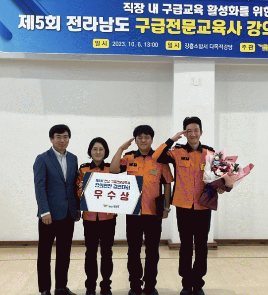 최기정 강진소방서장은 “대원들이 역량을 발휘해 수상한 모습을 보니 너무 기쁘며, 경연주제를 적극 활용하여 직장 내 구급교육을 활성화 하겠다.“고 전했다.