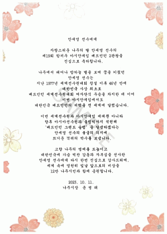 윤 시장은 축전에서 “대한민국 사상 최초로 세계선수권대회 여자단식 우승을 차지한 데 이어 이번엔 아시안게임에서도 대한민국 배드민턴의 저력을 전 세계에 알렸다”면서 “이번 항저우 아시안게임 배드민턴 2관왕을 진심으로 축하한다”고 전했다.