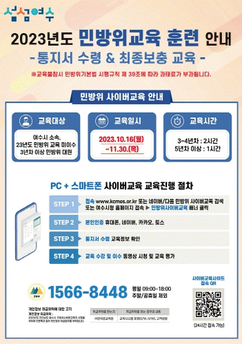사이버교육은 여수시청 홈페이지에 있는 링크배너를 클릭하거나 포털사이트에서 ‘민방위사이버교육’에 직접 접속해 PC와 스마트폰 등으로 24시간 수강이 가능하다.
