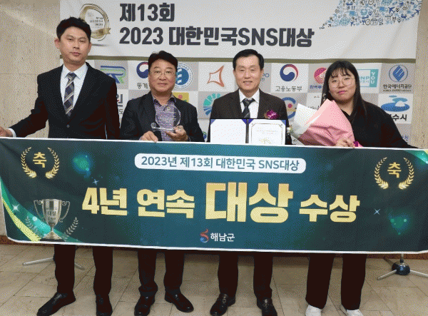 특히 해남군은 2019년 최우수상에 이어 2020년부터 4년 연속 대상을 수상하면서 소셜미디어를 통한 군정의 홍보 성과를 높이 인정받고 있다.