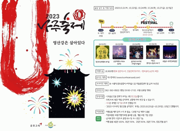 영산강 선상 퍼레이드, 뮤지컬 개막 공연 등 축제 메인 프로그램 관람·체험과 함께 관광객들에게 나주의 역사·문화, 힐링 공간을 둘러볼 수 있는 여행 기회를 저렴한 가격에 제공할 계획이다.