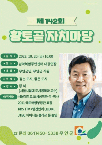 김산 무안군수는 “황토골 자치마당을 통해 도시의 미래를 엿볼 수 있는 좋은 강연이 열리니 관심 있는 주민들의 많은 참여와 성원을 바란다”고 말했다.