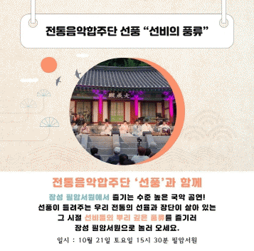 이번 무대의 주인공은 민속공연단 ‘선풍’이다. 가야금, 거문고, 대금, 해금, 아쟁 등 전통악기로 구성된 합주단으로, 국악의 아름다운 선율을 감동적으로 펼쳐 보인다. 오후 3시 30분 필암서원 청절당 앞마당에서 만날 수 있다.