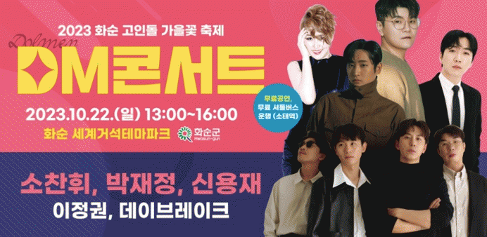 10월 22일 오후 1시부터 세계거석테마파크 주무대에서 ‘DM 콘서트’가 개최된다. 마음을 움직이는 감미로운 음색으로 무장한 박재정, 신용재, 이정권을 비롯하여, 폭발적인 가창력을 자랑하는 소찬휘, 개성 넘치는 데이브레이크가 출연하여 가을 감성이 충만한 젊음의 무대로 공연장을 수놓을 예정이다.
