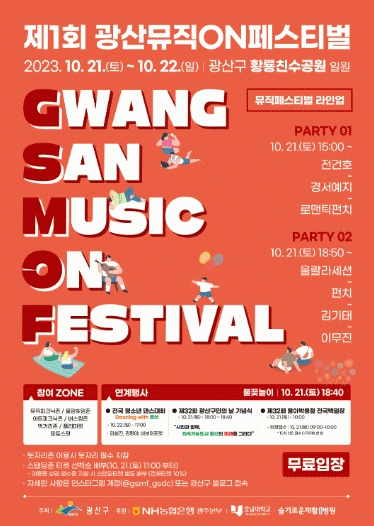 또 광산뮤직ON페스티벌 첫 개최를 기념해 제32회 광산구민의 날 기념식, 제32회 용아백일장 등도 21일 황룡친수공원에서 함께 진행한다.
