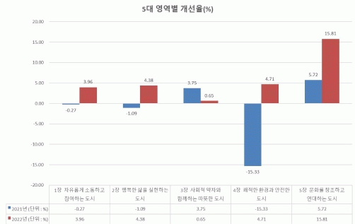 5대 분야 중 ‘문화를 창조하고 연대하는 도시’ 영역이 15.8%로 개선율이 가장 높았으며, ‘사회적 약자와 함께하는 따뜻한 도시’ 영역 개선율이 0.7%로 가장 낮게 나타났다.