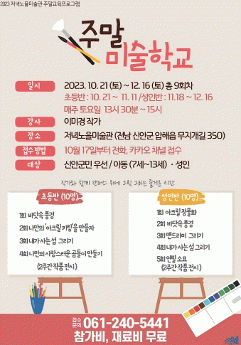 프로그램의 참여 비용은 무료이며 신청 기간은 오는 10월 17일부터 10월 20일까지 4일간으로, 신안군민 우선으로 아동 7세~13세 10명, 성인 10명을 모집한다. 전화 또는 카카오톡 신안군 저녁노을미술관을 검색 후 카카오 채널을 통해 선착순으로 접수한다.