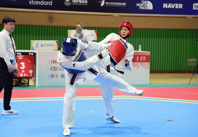 장흥실내체육관에서 펼쳐지는 태권도 경기는 전국체전 마지날인 19일까지 남녀 체급별 경기가 이어진다.