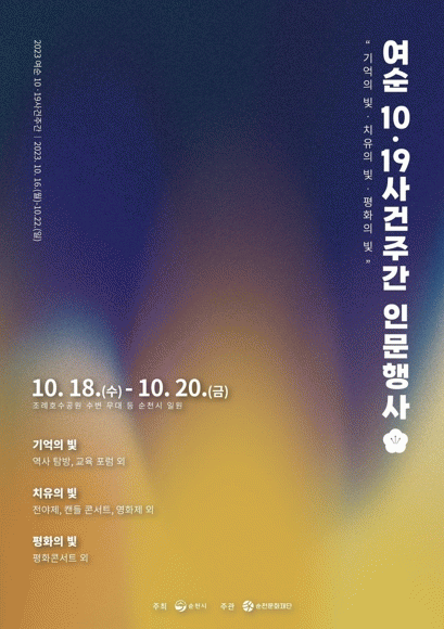 순천시 관계자는 “여순 10·19사건주간 인문행사를 위해 문화와 예술의 향연의 장을 마련한 만큼 유가족의 아픈 상처가 치유되고 지역민이 위로를 건네는 자리가 되길 바란다”라고 전했다.