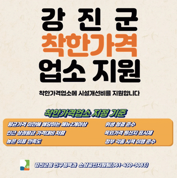 착한가격업소 지정 기준은 강진군 소재 외식업, 이·미용업, 세탁업 등 서비스 업종 가운데 ▲평균 가격 미만에 해당하는 메뉴 2개 이상 ▲인근 상권 평균 가격 대비 저렴 ▲높은 이용 만족도 ▲위생·청결 준수 ▲옥외가격·원산지 표시제 등 중앙 및 지자체 각종 시책 이행 등을 준수한 업체 가운데 선정된다.