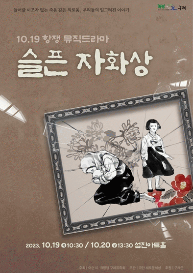 19일 오전 10시 30분에는 극단 ‘새로운 세상’이 공연하는 여순사건 기획연극 ‘뮤직드라마 슬픈 자화상’이 구례군 섬진아트홀에서 막을 올릴 계획이다. 19일과 20일 양일간 공연하는 이번 연극은, 제주 4·3으로부터 구례까지 이어진 여순사건의 아픔에 대해 휴머니즘과 위트를 담아 역사적 트라우마를 치유하는 장으로서 기획됐다.