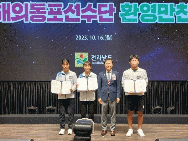 전남도가 고국을 방문한 해외동포선수단을 환영하고 격려하기 위해 지난 16일 저녁 남악 스카이웨딩컨벤션에서 개최한 환영행사에서 세계한인체육회 총연합회가 사이클 전남체고 강소은, 전남체중 오유라, 전남체중 레슬링 김예찬 등 유망선수 3명에게 장학금 각 100만 원을, 재독일선수단은 전남체고 육상 송수하에게 1천 유로를 전달했다.