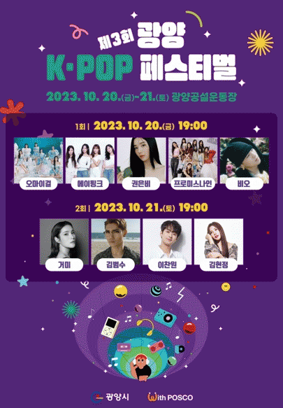 한편, 제3회를 맞는 광양 K-POP 페스티벌은 오는 20일과 21일 이틀에 걸쳐 오마이걸, 에이핑크, 권은비, 프로미스나인, 비오 등 최강 라인업의‘K-POP’공연과 거미, 김범수, 이찬원, 김현정 등 인기 가수들이 대거 출동하는‘7080 · 트롯’이 차례로 열린다.