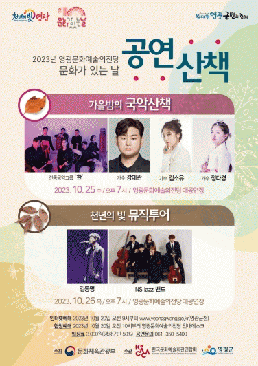 첫째날‘가을밤의 국악산책’으로 지역내 순수 전통국악그룹‘한’이 사철가, 새타령, 국악가요 등을 전통국악 반주 또는 퓨전으로 재해석하여 신선한 콜라보레이션을 선보인다. 더하여, 판소리와 트로트 하는 남자 강태관, 내일은 미스트롯의 참가하여 간드러지면서 파워풀한 가창력을 선보인 김소유, 청순한 비주얼에 완벽한 무대매너로 감탄을 이끌어낼 정다경이 전통과 현대를 넘나드는 무대로 보는 이들의 감탄을 이끌어낼 것으로 기대된다.