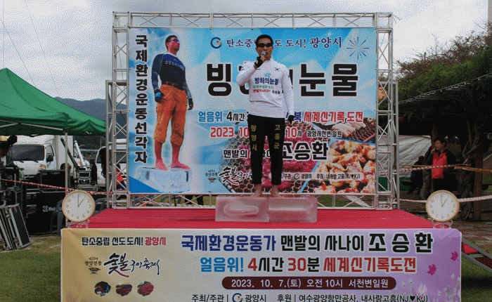 한편, ‘맨발의 사나이’ 조승환 씨는 지난 7일 제19회 광양 전통숯불구이 축제에서 얼음 위 맨발로 오래 서 있기 4시간 30분을 성공, 세계신기록을 경신했다. 오는 11월 3일 독일 뒤셀도르프에서 자신이 보유한 세계신기록에 또다시 도전한다.