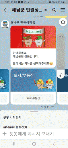 접속하려면 휴대폰 카카오톡에서‘해남군 민원상담톡’을 검색하여 친구목록에 추가한 뒤‘챗봇 시작하기’ 메뉴를 누른 후 원하는 분야를 단계적으로 클릭하여 내용을 확인하거나 찾고 싶은 내용을 직접 입력하여 답변을 확인할 수 있다.