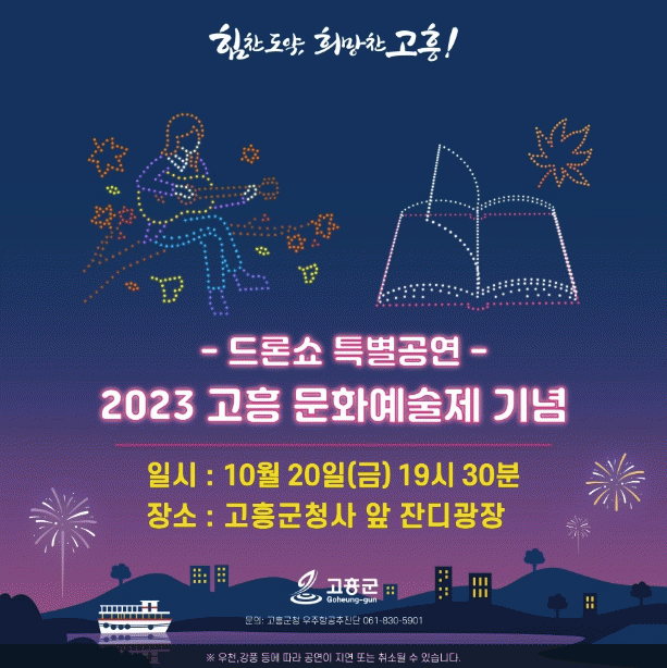 이번 특별공연은 드론 500대 규모로 ‘2023 고흥 문화예술제’의 ▲개막식 및 축하공연 ▲돗자리 영화제 등 다양한 볼거리와 함께 지역주민이 공감하며 즐길 수 있는 콘텐츠로 구성된다.